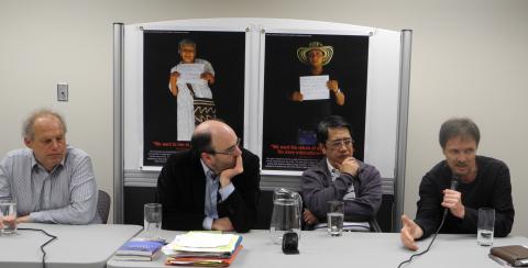 (From left) Kevin Williams (Publisher, Talonbooks), Alain Deneault (author of Imperial Canada Inc. - Legal haven of choice for the world's mining industries), Chandu Claver (Human rights activist), and Rob Wipond (Investigative journalist).